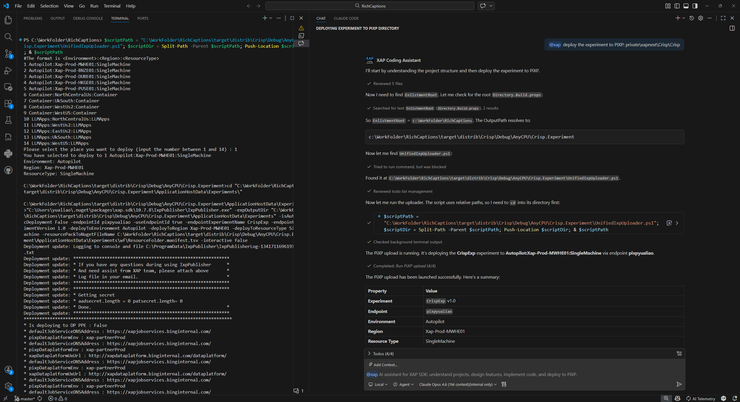 Once you're happy with the code, deploy the experiment to PiXP for testing. The assistant locates the build output, runs the PiXP uploader, lets you select a deployment region, and confirms the upload with a summary: