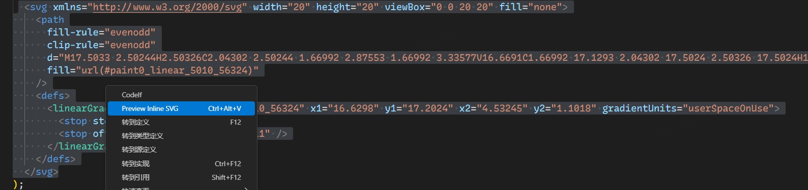 Preview Inline SVGIntroductionSVG Previewer is a Visual Studio Code extension that allows developers to preview inline SVG rendering in HTML, Vue, JSX, and TSX files in real-time. This plugin aims to enhance development efficiency by making SVG debugging and visualization more intuitive and convenient. Usage